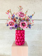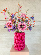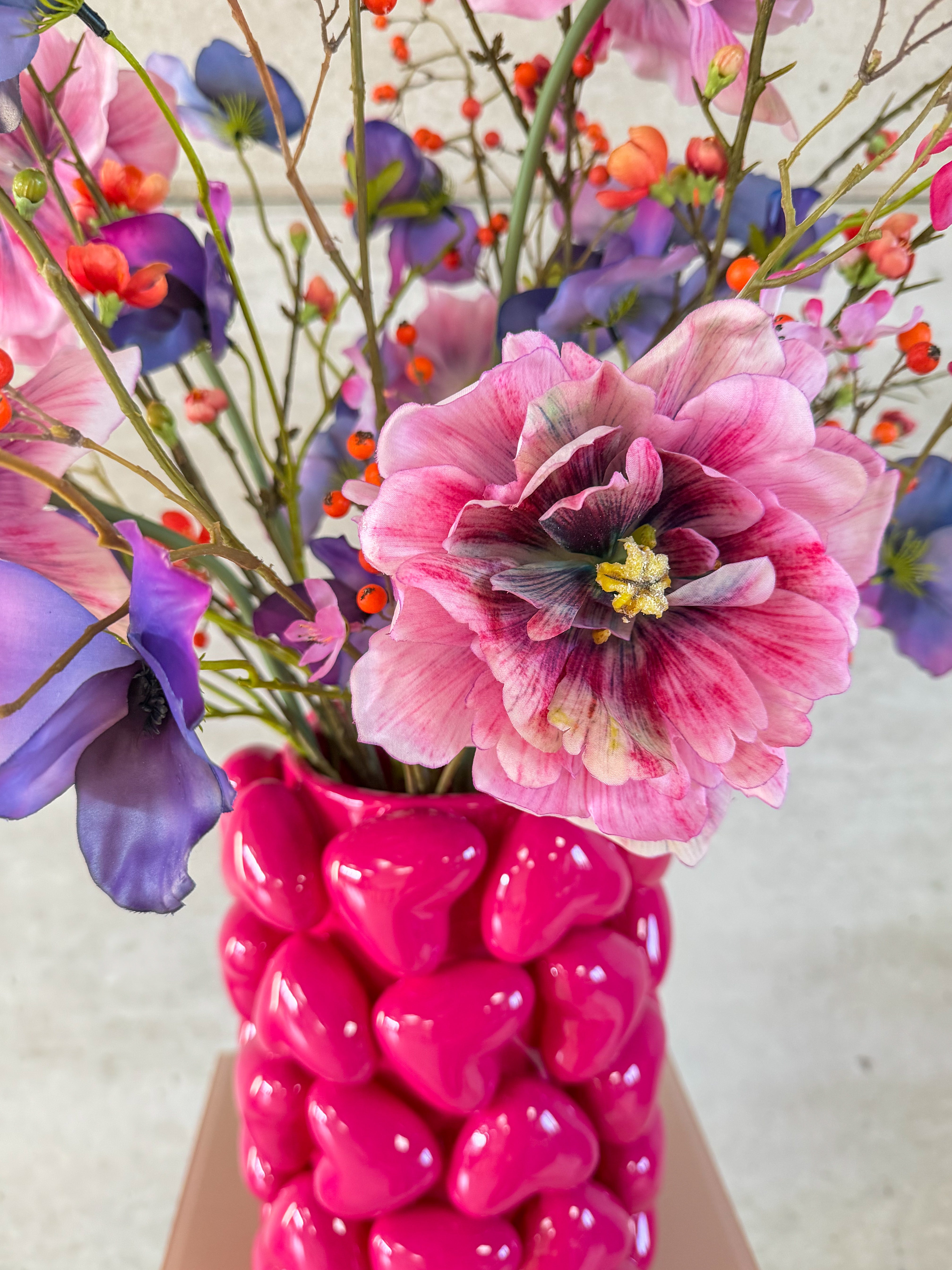 Een knalroze vaas vol hartjes, vrolijk, gedurfd en niet te missen.