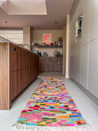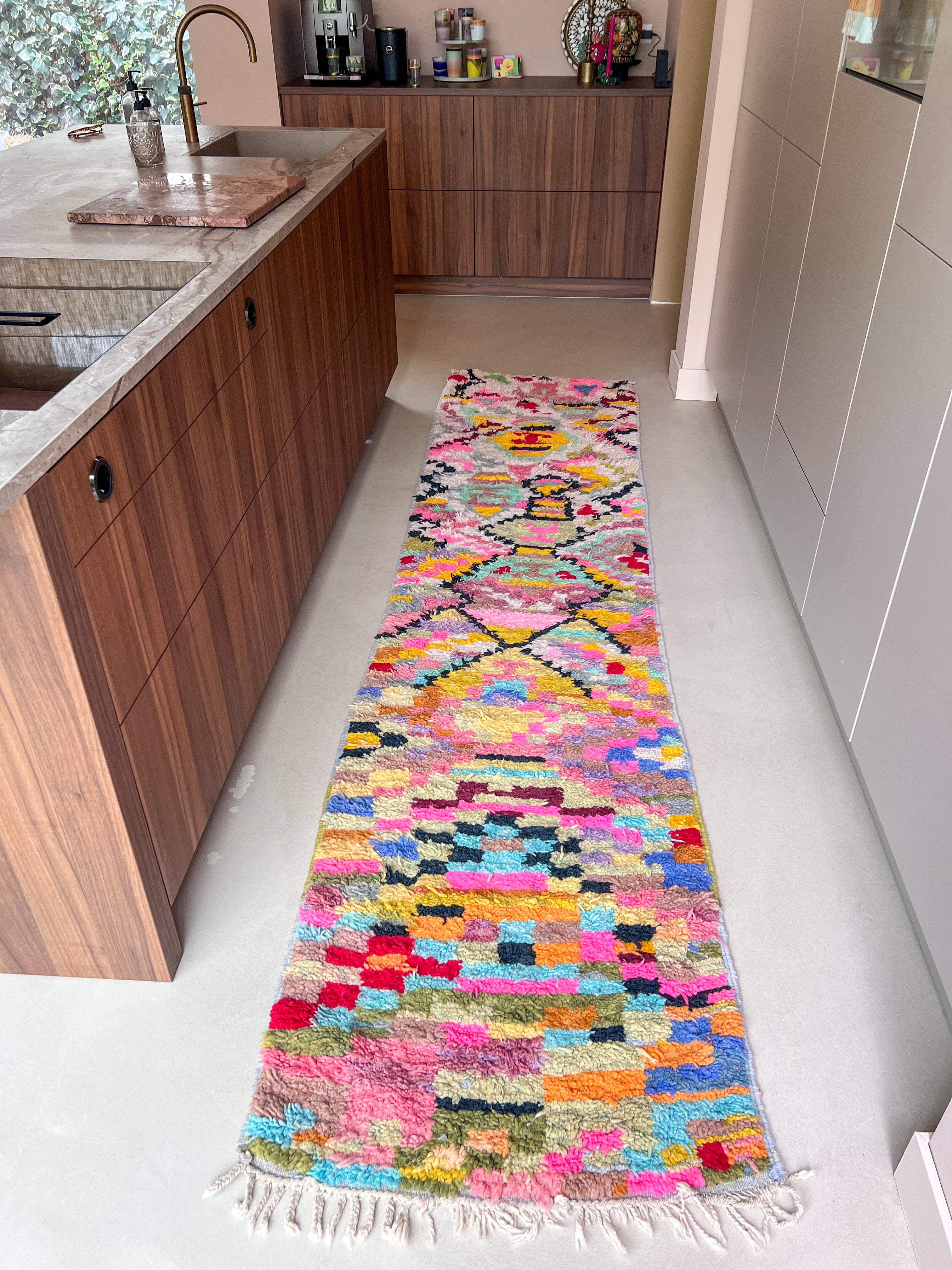 De vrolijke kleuren en speelse patronen maken dit kleed tot een echte blikvanger — perfect om wat levendigheid toe te voegen aan je keuken, hal of woonkamer.