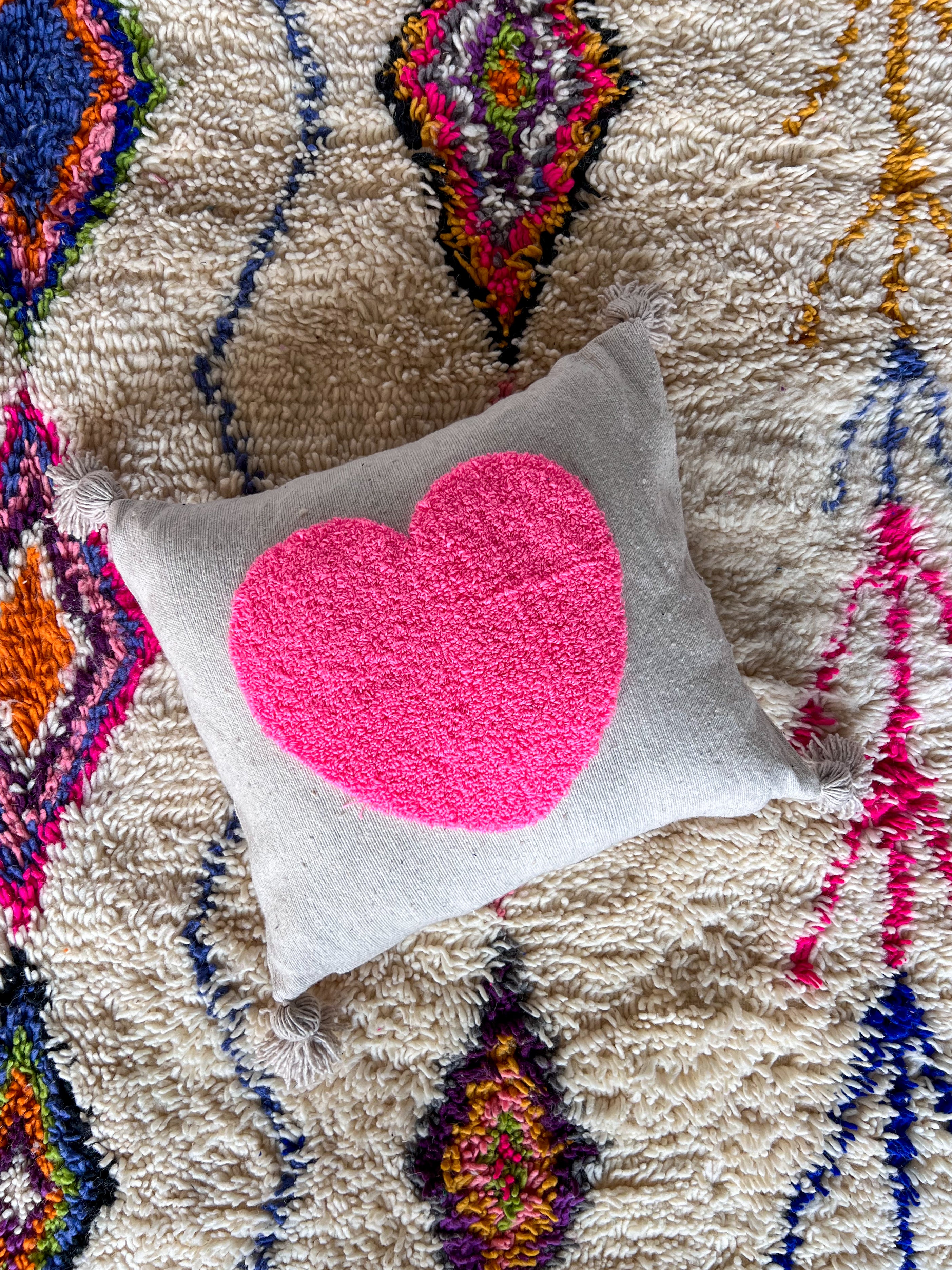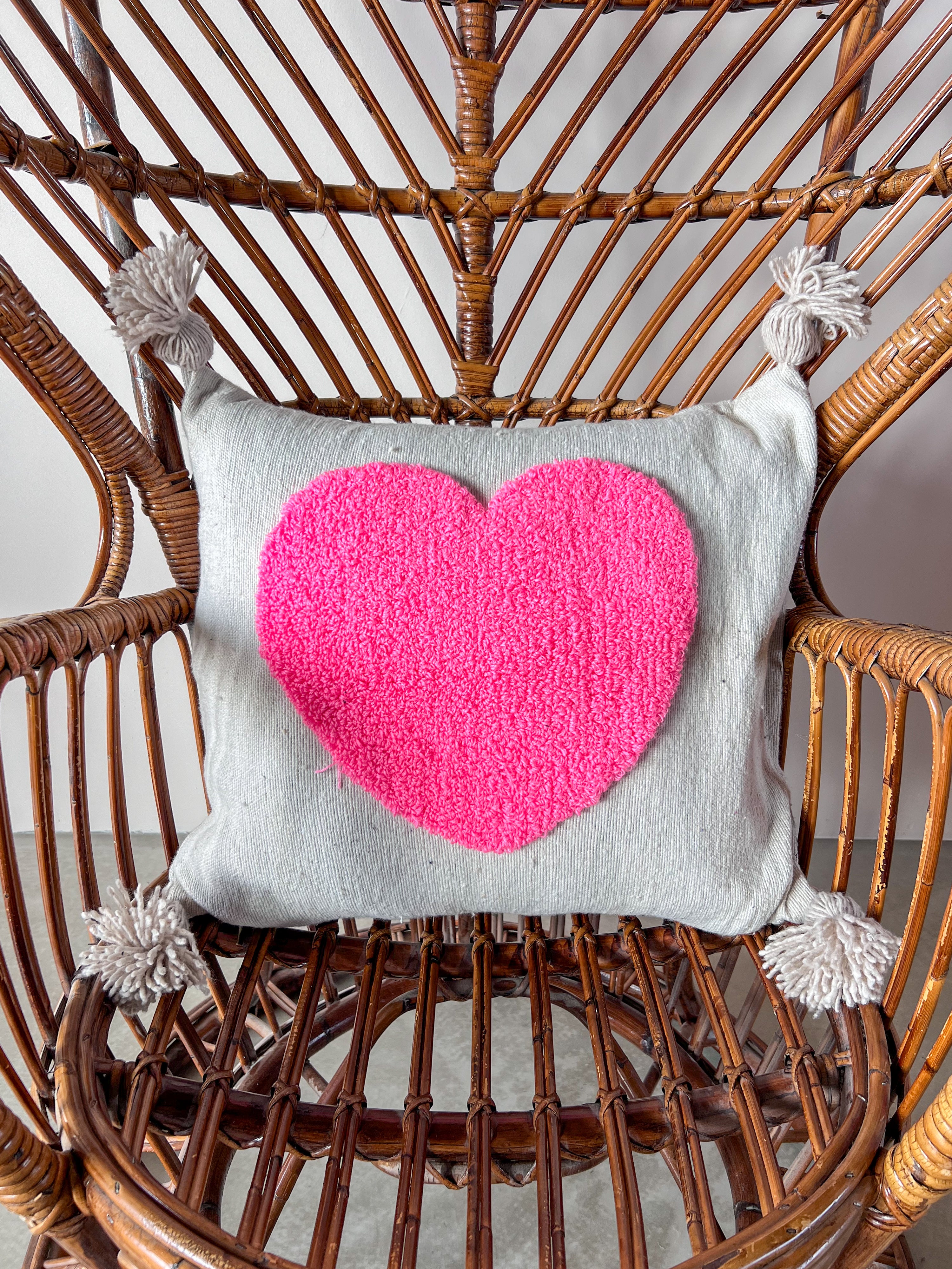 Kussen uitgevoerd in een grijze basisstof met roze hart en flosjes op de hoeken.