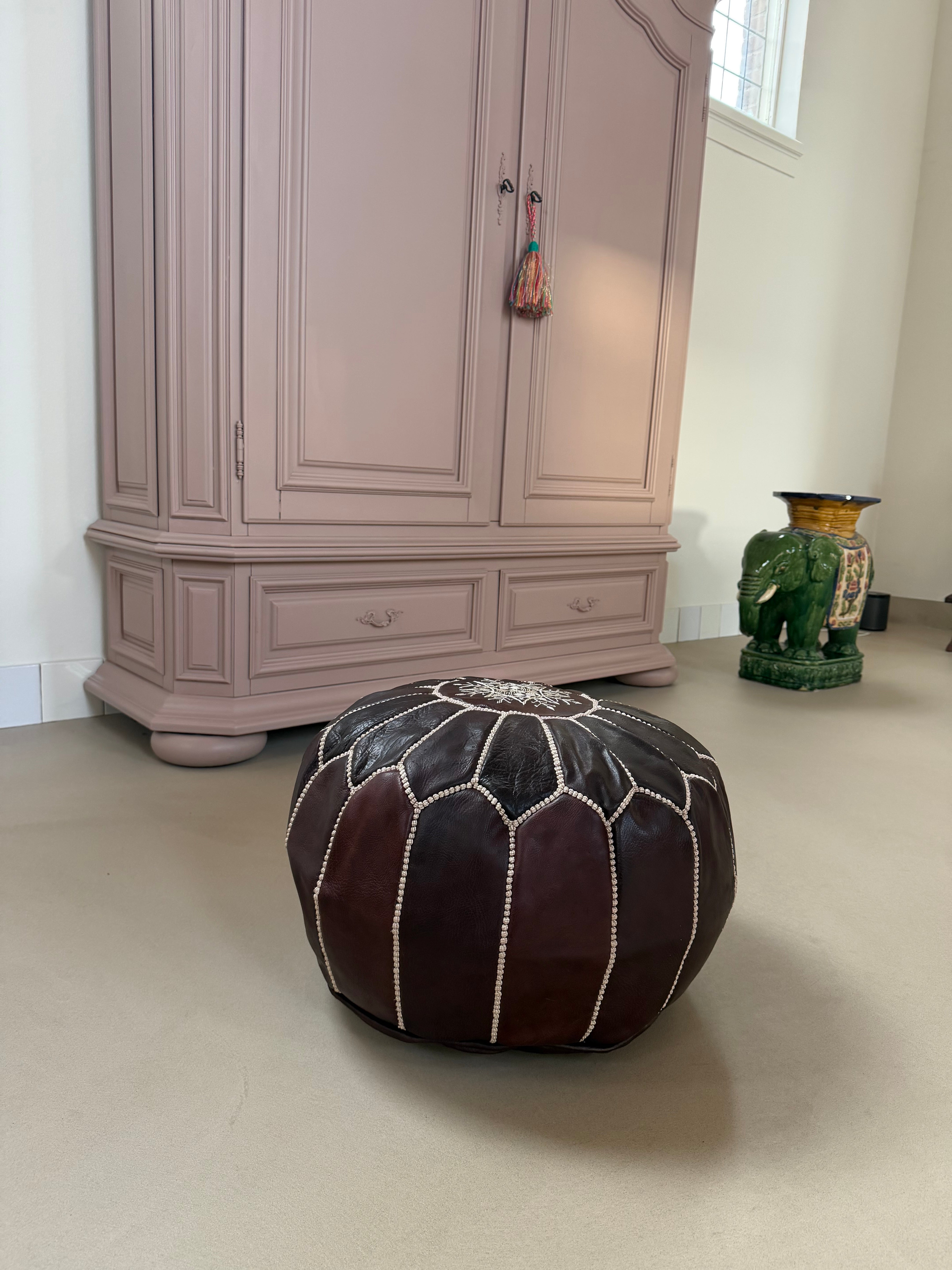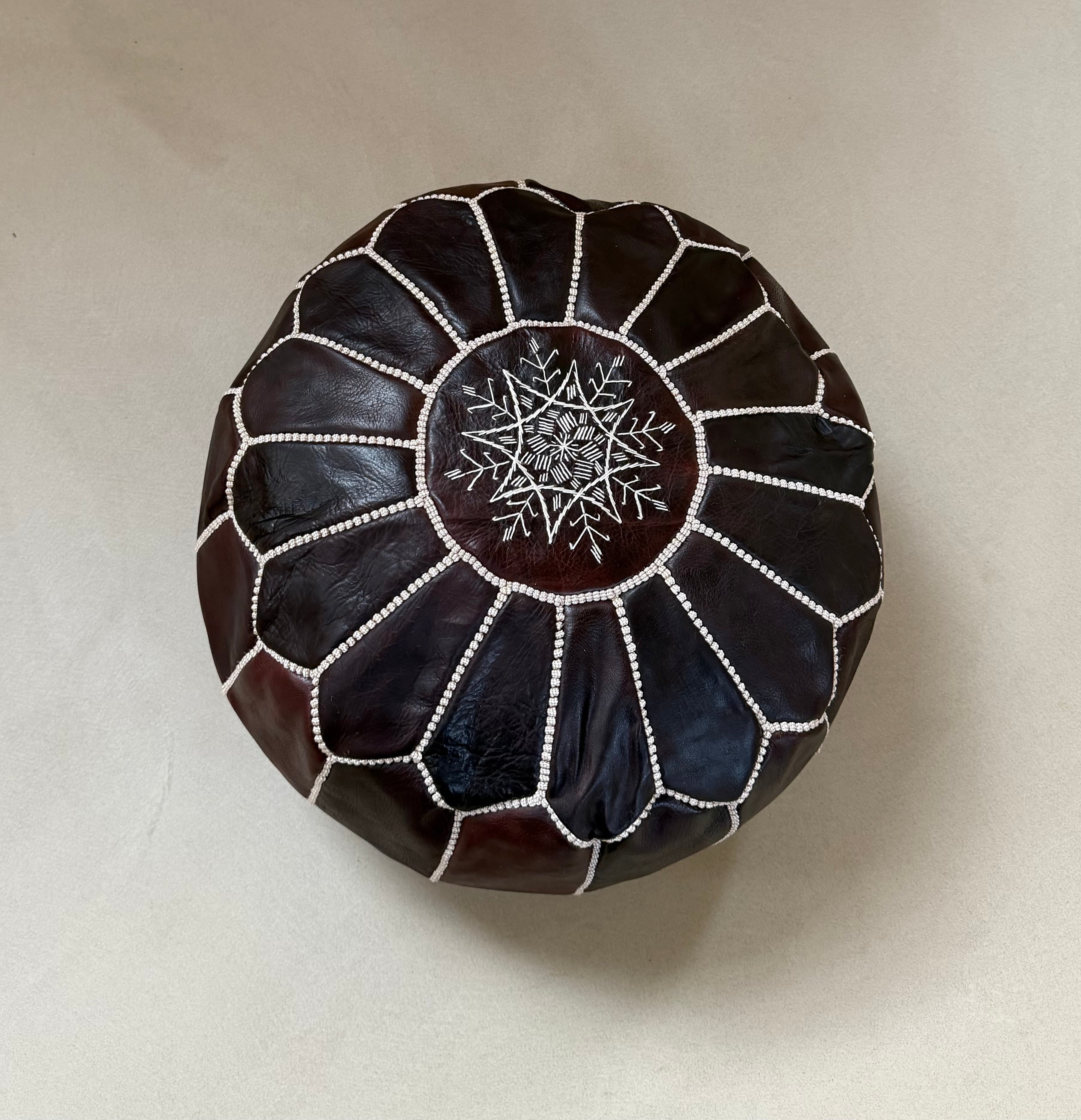 Deze prachtige poef is handgemaakt in Marokko van hoogwaardig leer en versierd met fijne borduursels. Elk stuk is uniek en ambachtelijk vervaardigd, waardoor het een authentieke en warme sfeer toevoegt aan je interieur.