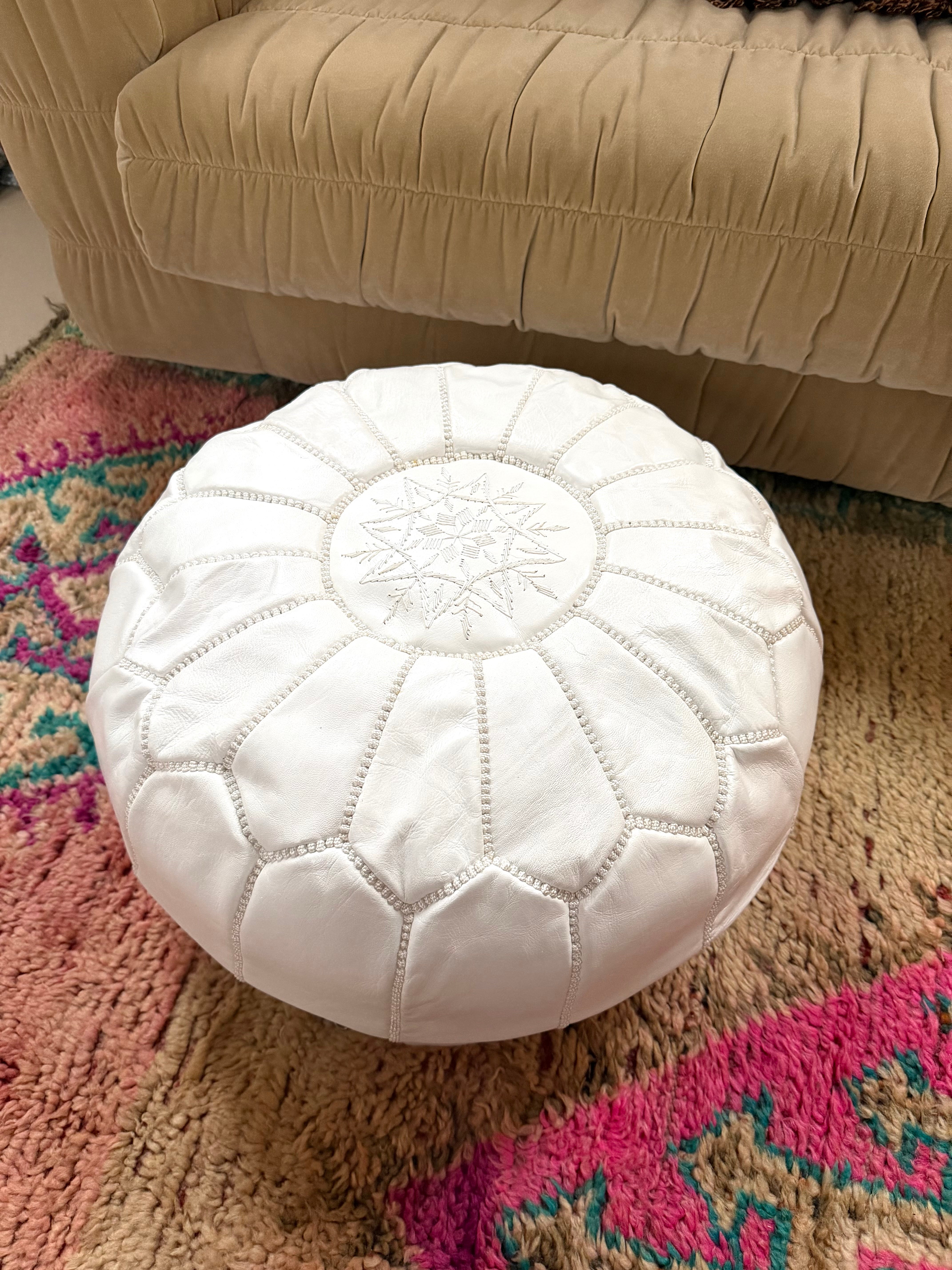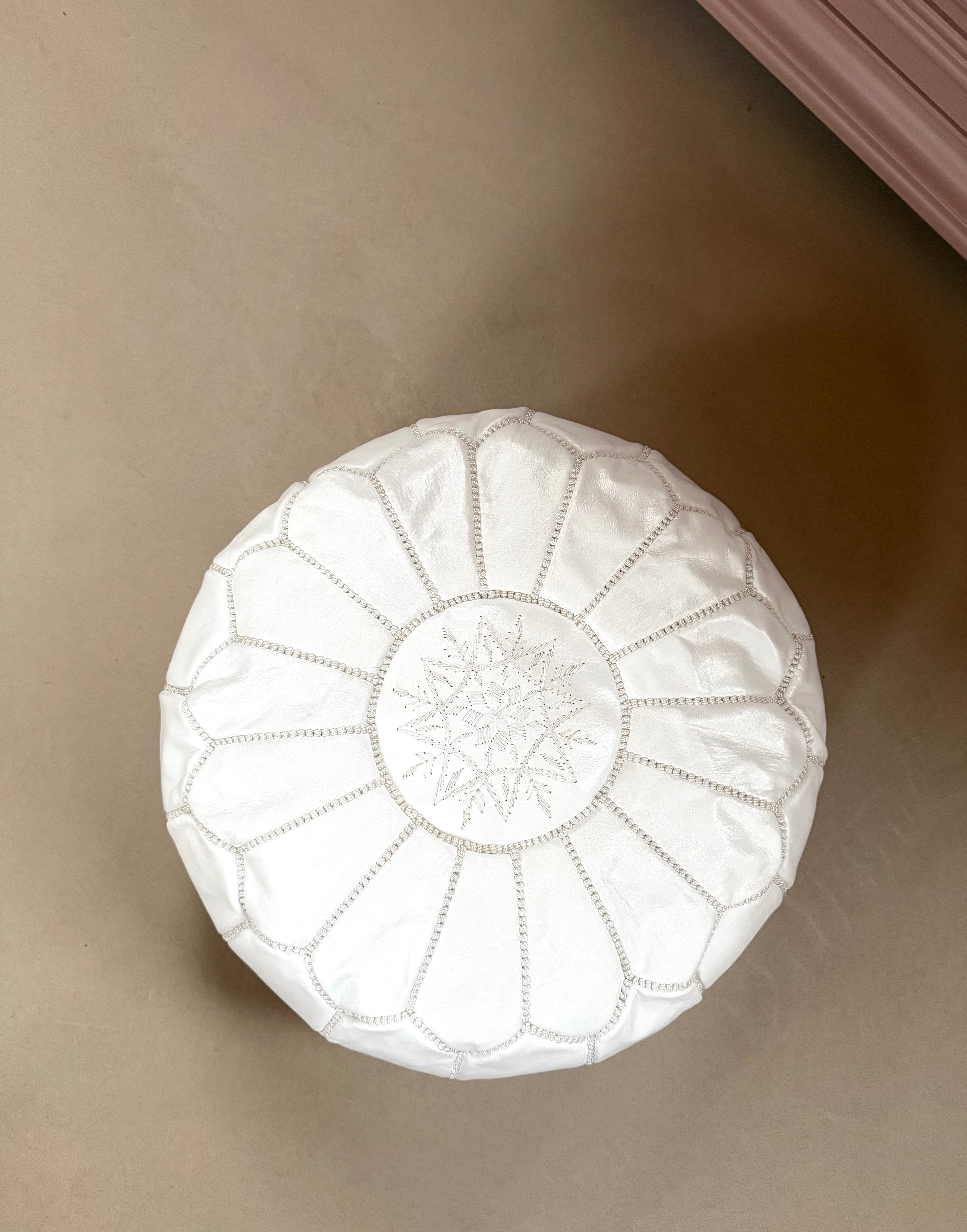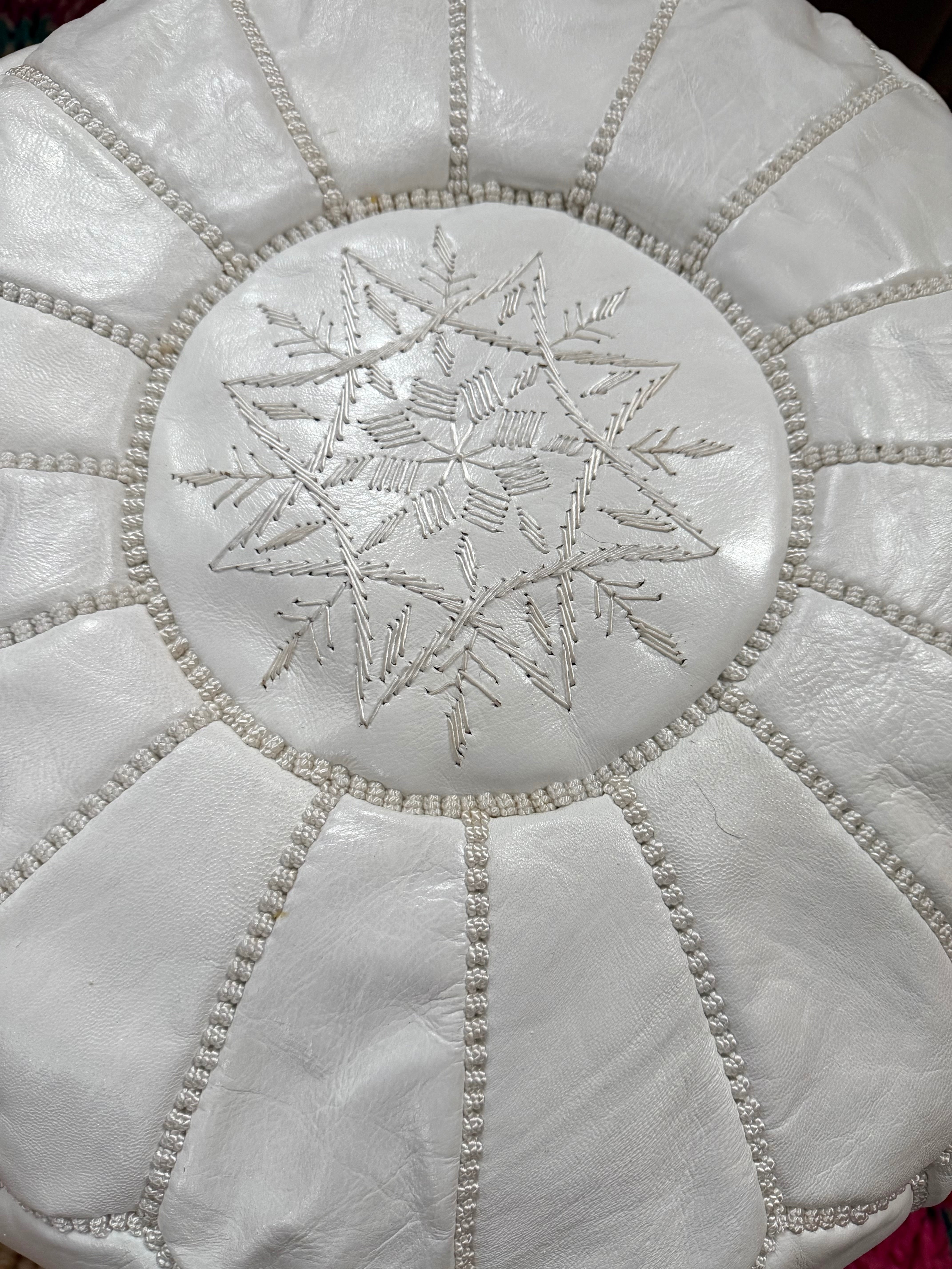 Deze prachtige poef is handgemaakt in Marokko van hoogwaardig leer en versierd met fijne borduursels. Elk stuk is uniek en ambachtelijk vervaardigd, waardoor het een authentieke en warme sfeer toevoegt aan je interieur.
