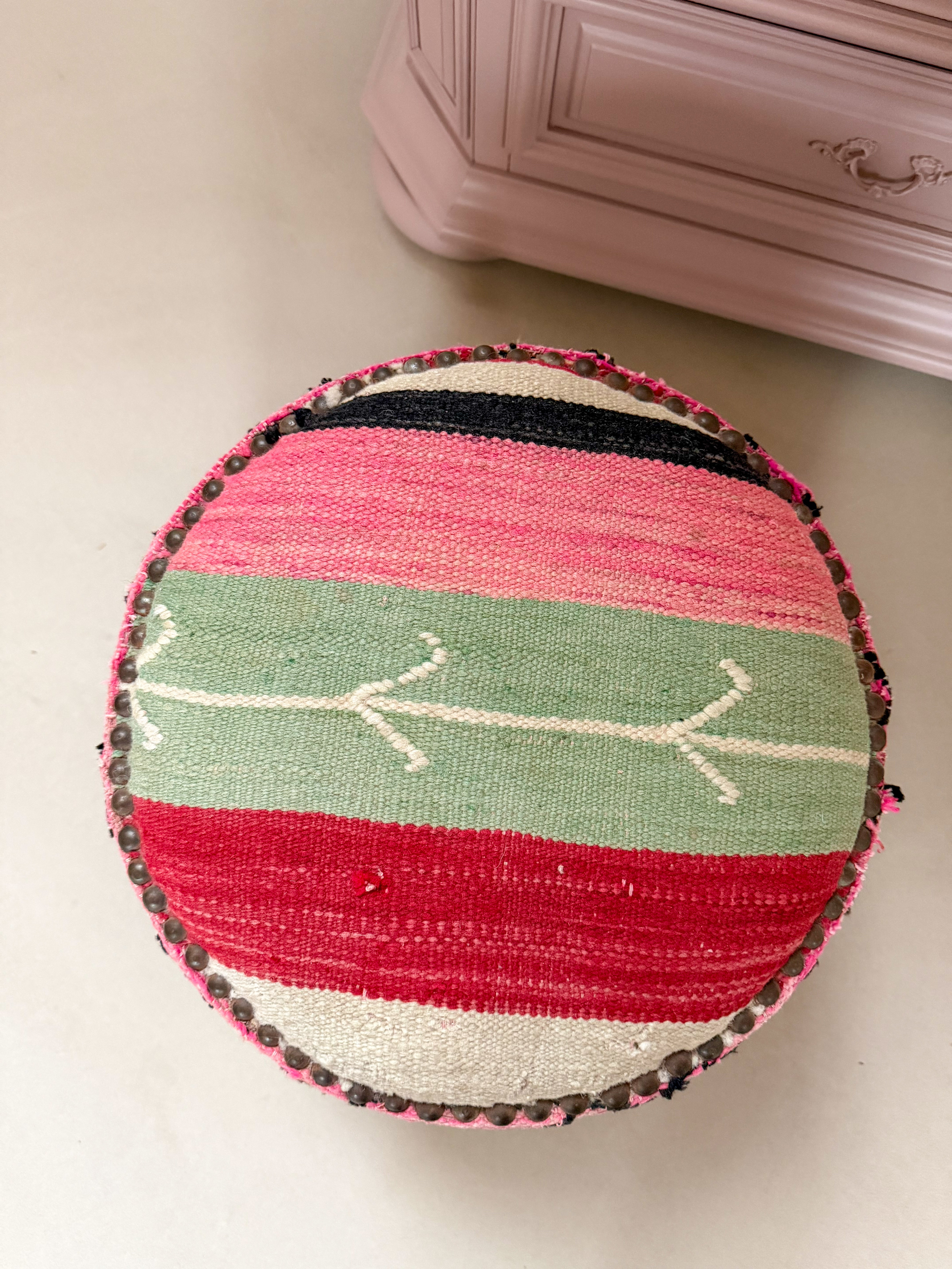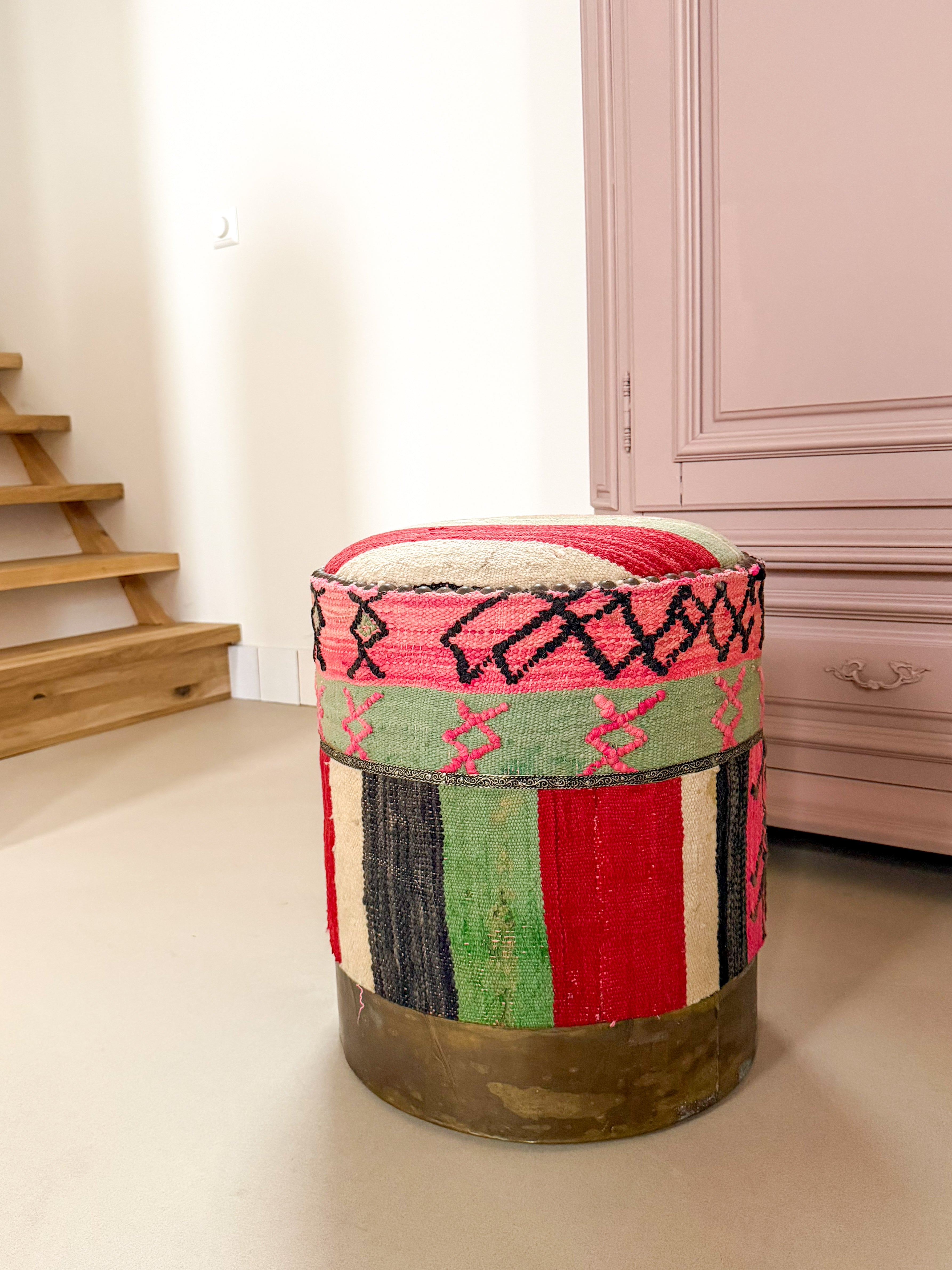 Dit krukje is in Marokko gemaakt. De basis is van hout en de bekleding is van kelim stof.